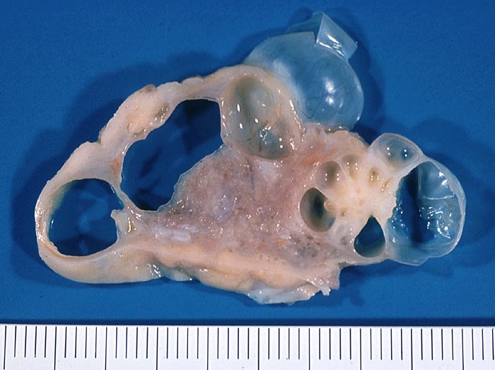 Multilokulärer zystischer Tumor. Die Zysteninnenauskleidung und Oberfläche ist glatt. Keine intrazystischen papillären Tumorproliferate.
