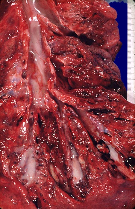 Die Bronchen sind leicht erweitert und gefüllt mit reichlich viskösem Schleim bis in die Peripherie.