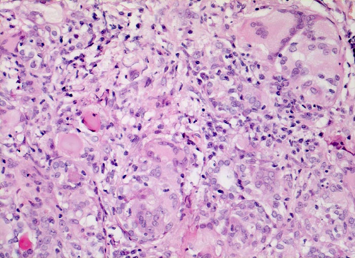 Granulomatöse Entzündung aus Riesenzellen und Lymphozyten. Dazwischen teilweise zugrundegegangene Follikel.