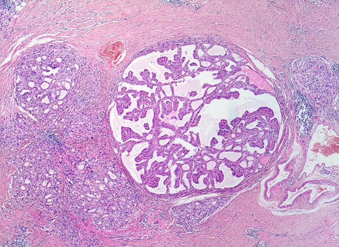 Ausgeprägte Vernarbung des Parenchyms mit herdförmigem chronischem Entzündungsinfiltrat. Kleintubuläre und solide Parenchymanteile, sowie kleine kolloidfreie Follikel. Ausserdem ein Regeneratknoten mit pseudopapillären Formationen.