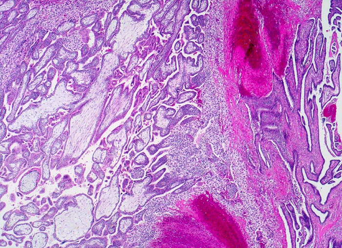 Rechts im Bild Tubenschleimhaut. Links im Bild Dezidua und Plazentarzotten aus Frühschwangerschaft.