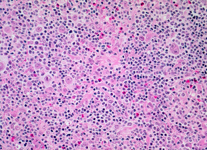 Die neoplastischen einkernigen Hodgkin Zellen und mehrkernigen Reed-Sternberg Zellen werden umgeben von einem reaktiven Zellgemisch aus Lymphozyten, Histiozyten, eosinophilen Granulozyten und Plasmazellen. Eine Parenchymfibrose fehlt.