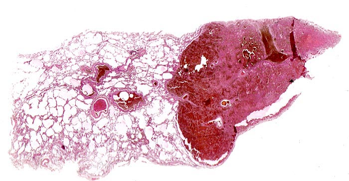 Frische blutdurchtränkte dreieckige Nekrosezone ohne Organisationszeichen in der Peripherie des Infarktes. Als Ursache für den Infarkt lässt sich im angrenzenden Lungenparenchym ein frischer Embolus in einem peripheren Lungenarterienast nachweisen. Auch dieser zeigt keine Organisationszeichen (kein Kontakt zwischen Gefässwand und Embolus).