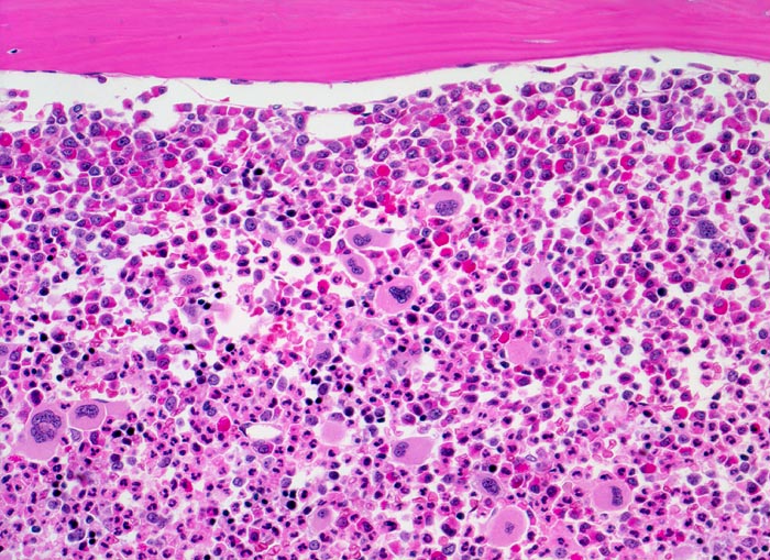 Hochgradig gesteigerte voll ausreifende neutrophile Granulopoese. Erkennbar sind verschiedene Reifungsstufen der Granulopoese, wobei die unreiferen Vorstufen (Myelozyten, Promyelozyten) bevorzugt entlang des Spongiosabälkchens paratrabekulär lokalisiert sind. Zur Mitte des Markraumes hin folgt die Reifungszone mit Prädominanz segmentkerniger Neutrophiler. Die normoblastäre Erythropoese ist fast vollständig verdrängt. Typisch ist die Vermehrung kleiner Megakaryozyten mit hypolobulierten Kernen.