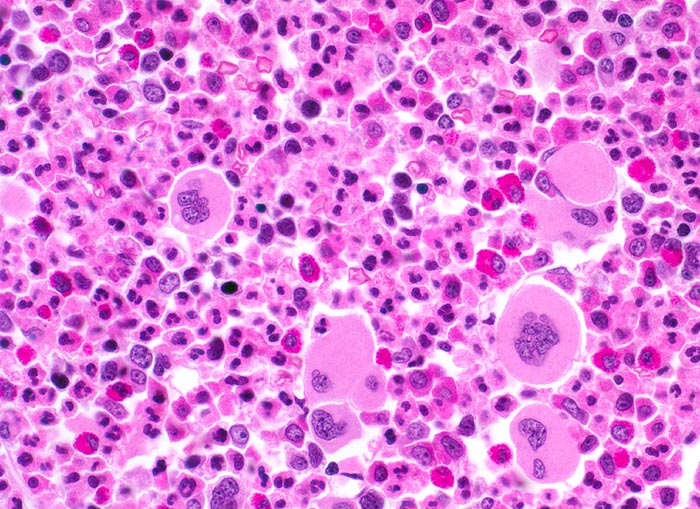 Ausschnitt aus der Mitte des Markraumes mit Überwiegen reiferer Elemente der Granulozytopoese mit zahlreichen vollständig ausgereiften segmentkernigen neutrophilen Granulozyten und mehreren kräftig roten segmentkernigen eosinophilen Granulozyten. Die verschiedenen unreiferen Zelltypen der Granulopoese können in der HE Färbung nicht sicher voneinander abgegrenzt werden. Nur ganz vereinzelt lassen sich Reste der roten Blutbildung nachweisen. Vermehrte kleine, teils in Gruppen liegende Megakaryozyten mit hypolobierten Kernen.