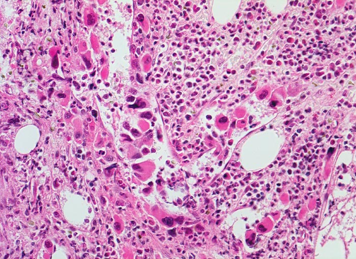 Vermehrung von atypischen, in Gruppen liegenden Megakaryozyten mit hypolobierten Kernen. Teils nacktkernige Megakaryozyten (d.h. praktisch ohne Zytoplasma). Die Megakaryozyten liegen in einem dilatierten Sinusoid bzw. unmittelbar daneben. Hyperplasie von ausreifenden Granulozyten. Erythropoese hypoplastisch. Durch die Fibrose entsteht der Eindruck von strömenden Zellen (links im Bild).