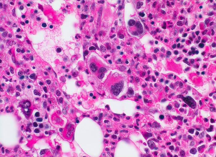 Neben atypischen, teils nacktkernigen Megakaryozyten zahlreiche Erythropoeseherde und myeloische Zellen verschiedener Reifungsstufen. Die Hämopoese ist auch in den dilatierten Markgefässen nachweisbar.