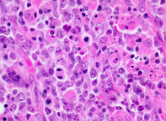 Mittelgrosse stark polymorphe Tumorzellen mit unregelmässig geformten, teils lobulierten oder eingekerbten Kernen. Oft sind mehrere randständige Nukleolen erkennbar (Zentroblastische Variante). Schmaler Zytoplasmasaum. Zahlreiche Histiozyten mit reichlich eosinophilem Zytoplasma und ovalen Kernen ohne Atypien. Mehrere Mitosen und Apoptosen als Ausdruck der raschen Zellproliferation.