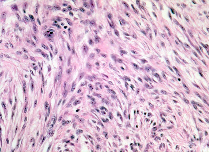 Spindelige Tumorzellen bilden ein geflechtartiges Muster. Die Morphologie erinnert an einen leiomyomatösen Tumor.