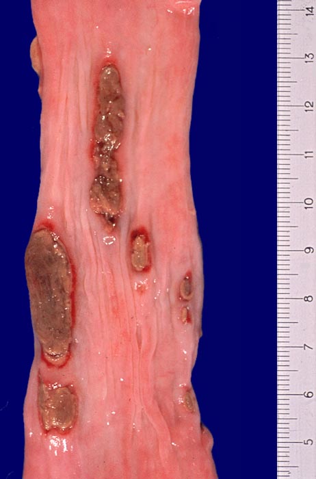 Scharf begrenzte von einem entzündlichen hämorrhagischen Randsaum umgebene braun-graue erhabene Soorbeläge. Dazwischen unauffällige Ösophagusschleimhaut.