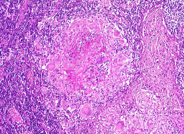 Links im Bild ein zentral verkäsendes Granulom mit Langhans Riesenzellen. Rechts davon Vermehrung von Kollagenfasern.
