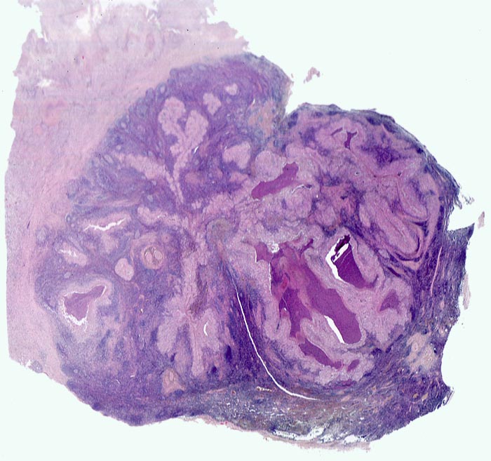 Links im Bild die stark fibrosierte Lymphknotenkapsel. Das Parenchym wird durchsetzt von girlandenförmigen Arealen mit zentraler Abszessbildung umgeben von einem hellen Saum aus Epitheloidzellen.