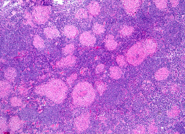 Zahlreiche nicht verkäsende Granulome durchsetzen das Lymphknotenparenchym.