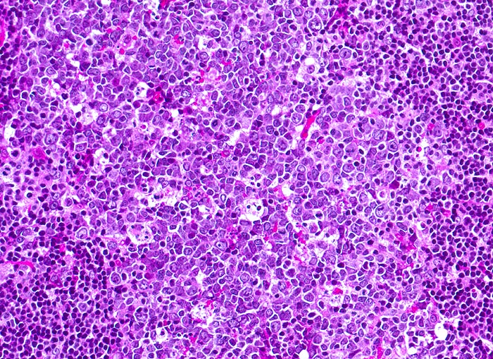 Ausschnitt aus einem Lymphfollikel mit grossem Keimzentrum. Im Keimzentrum finden sich neben kleinen Zentrozyten und grösseren Zentroblasten mehrere Sternhimmelmakrophagen mit phagozytierten Kerntrümmern.