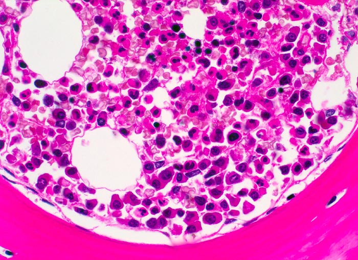 Normale topographische Verteilung der Blutbildung: unten im Bild angrenzend an das Spongiosabälkchen (paratrabekulär) unreife Vorstufen der Myelopoese mit gegen markzentral zunehmender Ausreifung (segmentkernige neutrophile Granulozyten oben im Bild). Ausserdem markzentrale Erythropoeseherde.