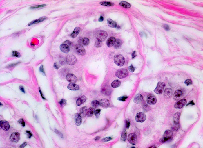 Das Epithel der Alveolen besteht aus einer inneren Schicht kubischer Zellen mit rundlichen Kernen und feinen Nukleolen. Aussen, der Basalmembran aufsitzend die Myoepithelschicht mit aufgeblasenem leer erscheinendem Zytoplasma und kleinen kondensierten Kernen.