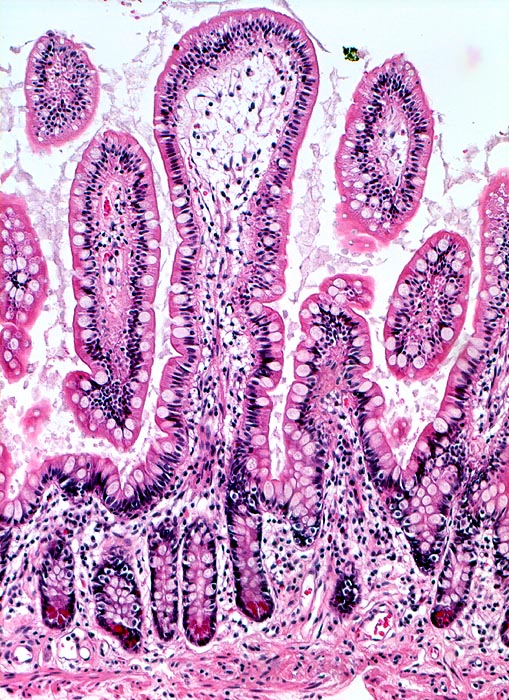 Im Wechsel angeordnete schlanke fingerförmige Zotten (mit resorptiven Zellen und schleimbildenden Becherzellen) und basal gelegene Krypten mit der zellreicheren Proliferationszone und roten Paneth'schen Körnerzellen. Ganz unten im Bild die dünne Lamina muscularis mucosae.