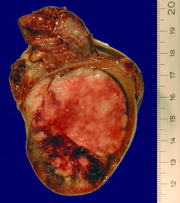 Gemischter Keimzelltumor des Hodens: Seminomanteil ca. 80% (mit Beimischung zahlreicher syncytiotrophoblastärer Riesenzellen mit beta-HCG Expression), embryonales Karzinom (ca. 20%).