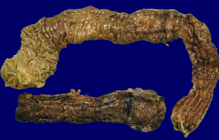 Gegen distal zunehmende Vergröberung des Faltenreliefs und zunehmende dunkelbraun Verfärbung. Beginnend im Colon transversum Schleimhautulzera, längsgestellt. Dazwischen Ausbildung von Schleimhautpseudopolypen. Makroskopisch keine verrukösen oder sonstigen tumorverdächtigen Areale.