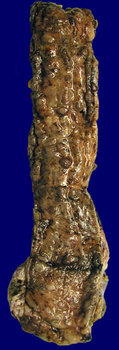 Völlig aufgehobenes Faltenrelief mit knotigen Pseudopolypen und längsverlaufenden Ulzera. Hämorrhagische Schleimhaut.