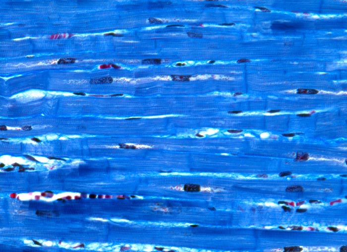 Syncytium von Herzmuskelfasern mit quergestreiftem Zytoplasma. Zwischen den einzelnen Zellen sind die etwas dunkleren Glanzstreifen gut erkennbar. Rund um die Zellkerne spindelförmige Aufhellung des Zytoplasma mit feinkörnigen Lipofuscinpigmentablagerungen.
