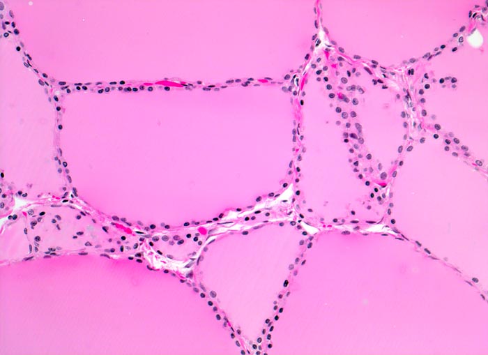 Unterschiedlich grosse Follikel ausgekleidet durch ein flaches bis kubisches Epithel. Das Lumen ist gefüllt mit dunkel gefärbtem Kolloid.