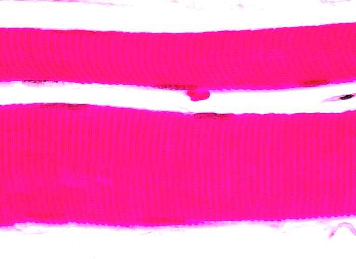 In der starken Vergrösserung ist deutlich die regelmässige Querstreifung des Zytoplasmas erkennbar, welche durch die versetzt angeordneten Aktin- und Myosinfilamente entsteht.