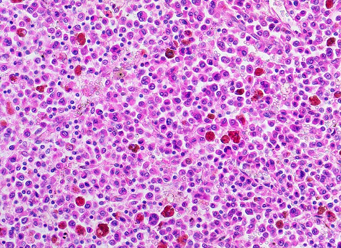 Verdrängung des Knochenmarks durch teilweise mehrkernige atypische neoplastische Plasmazellen. Zwischen den Plasmazellen farblose Erythrozyten und braune Histiozyten mit reichlich Hämosiderin im Zytoplasma.