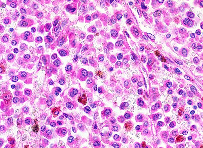 Tumor ausschliesslich aus atypischen Plasmazellen zusammengesetzt: exzentrisch gelagerte Kerne, ausladendes Zytoplasma. Grobes, randständiges Heterochromatin, im typischen Fall mit Radspeichenstruktur.