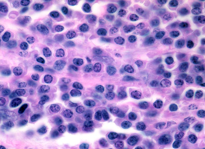 Die neoplastischen Plasmazellen bilden einen lockeren soliden Zellverband. Mehrere Kerne enthalten einen zentralen runden eosinophilen Einschluss ( Dutcher body).