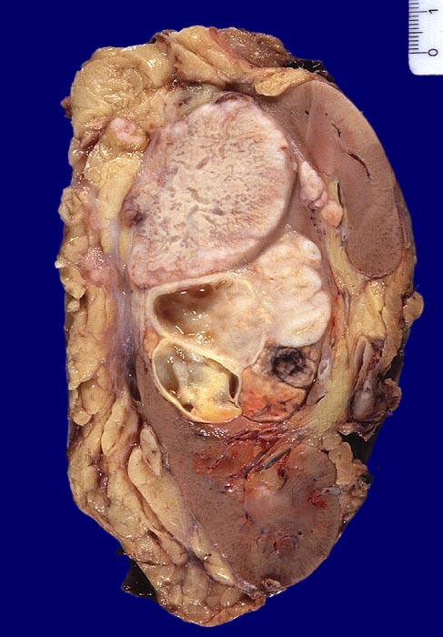 Im Nierenunterpolbereich und mittleren Abschnitt ein bunter, teils gelber, teils weisser, teils zystischer Tumor Dm 8,2cm. Fokale kleinere Einblutungen. Der Tumor infiltriert das Nierenbeckenfettgewebe und durchbricht auch die Nierenkapsel mit Infiltration des perirenalen Fettgewebes.