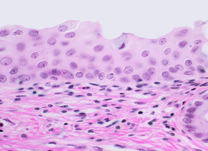 Das endozervikale Epithel wird im Bereich der Umwandlungszone ersetzt durch ein Plattenepithel aus monomorphen Zellen, welche zur Oberfläche hin keine Ausreifung zeigen und auf der gesamten Epithelbreite basalen Zellen gleichen. Obwohl die Kern-Zytoplasmarelation erhöht ist, zeigen die Kerne keine Atypien, das Chromatin ist fein verteilt, die Kernkonturen sind glatt, die Nucleolen sind klein und die Zellen sind regelmässig angeordnet. Zwischen den Plattenepithelzellen lassen sich vereinzelte noch nicht ersetzte Schleimzellen nachweisen.