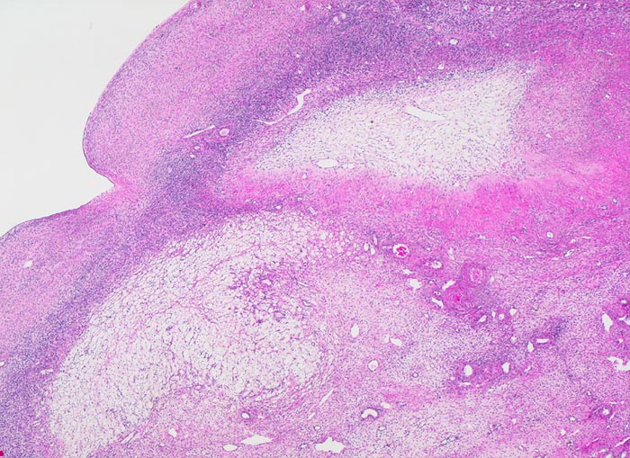 Rechts oben im Bild ein atretischer Follikel: Die zentrale Zone wird durch lockeres Bindegewebe ersetzt. Die Zona pellucida (Basalmembran) ist kollabiert und ist gekräuselt und umfasst das lockere Zentrum. Degenerierendes Corpus luteum menstruationis links unten im Bild bestehend aus hellen Granulosaluteinzellen mit lipidreichem Zytoplasma und pyknotischen Kernen.