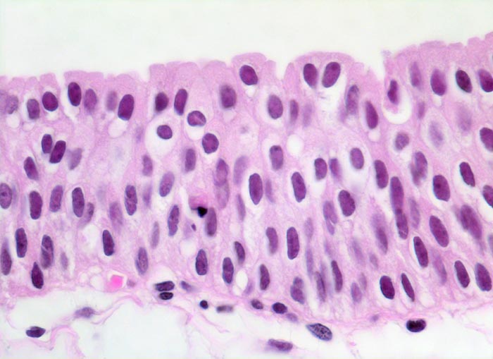 Regelmässig geschichtetes mehrreihiges Urothel ohne Zellatypien.