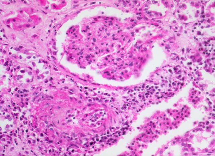 Unauffälliger Glomerulus. Links unten im Bild eine kleinere Arterie mit segmentaler fibrinoider Gefässwandnekrose. Das Lumen ist gefüllt mit Entzündungszellen. Im Interstitium rund um das betroffene Gefäss ist ebenfalls ein gemischtes Infiltrat erkennbar.