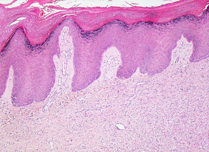 Die Epidermis über dem unscharf begrenzten dermalen Tumor ist hyperplastisch. Die Reteleisten sind verlängert. Es besteht ausserdem eine leichte Hyperkeratose. Intradermal findet sich ein mässig dichtes, unscharf begrenztes Tumorzellinfiltrat, welches die Kollagenfasern aufsplittert.