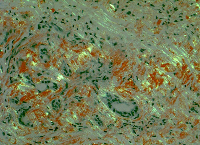 Massenhaft kongorote und in der Doppelbrechung teilweise flaschengrün erscheinende Amyloidablagerungen im Stroma.