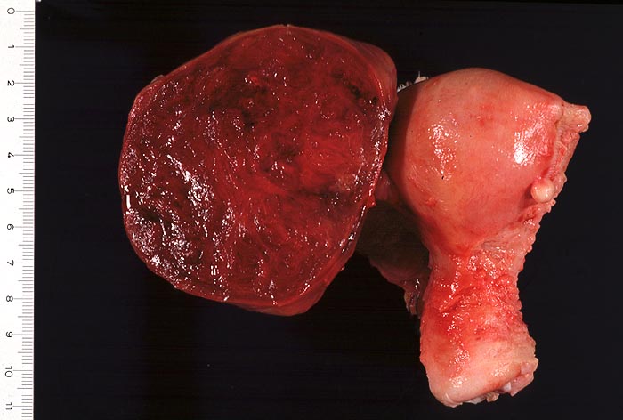 grosses, gestieltes, subseröses Myom. Deutliche Torsion des Stiels und blau-grauer livider Aspekt des ansonsten typisch aufgebauten Myoms. An der Myomoberfläche einzelne feine Verwachsungsstränge.