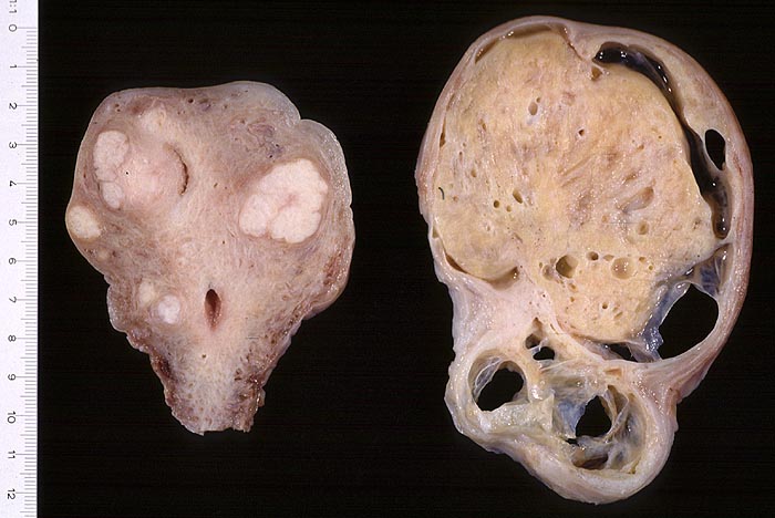 Teil knotig aufgetriebenen Uterus durch einen mehrkammerigen, partiell zystisch umgewandelten, teils knotigen, grauweissen, teils gelben Tumor eingenommen, die gelben Tumorabschnitte glasig,
