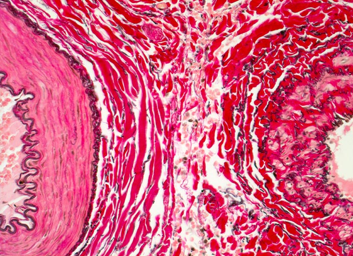 Links im Bild ein Arterienanschnitt, rechts im Bild die begleitende Vene ungefähr von gleichem Kaliber. Die Arterie hat eine deutlich erkennbare gewellt verlaufende subendotheliale Membrana elastica interna. Darauf folgt die glatte Muskulatur der Media, welche abgeschlossen wird durch die Membrana elastica externa. Die Membrana elastica interna der Vene ist ebenfalls abgrenzbar. Die übrige Venenwand besteht aus einer Mischung von glatter Muskulatur (gelb), elastischen Fasern (schwarz) und Kollagenfasern (rot). Eine klar abgrenzbare Membrana elastica externa ist nicht erkennbar.