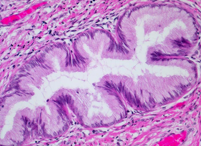 Endozervikale Drüse mit hochprismatischem Epithel, basalständigen Kernen und reichlich hellem Zytoplasma.