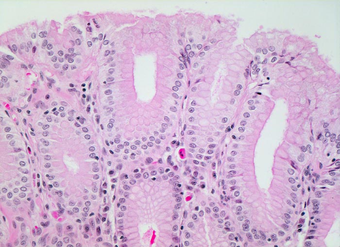 Oberfläche der Magenmukosa und Foveolae gastricae ausgekleidet durch muköse Oberflächenzellen mit basalen Kernen und reichlich blassem Zytoplasma und ebenfalls schleimbildenden Nebenzellen zum Drüsenhals hin. Zwischen den Foveolae sehr wenig Stroma (Lamina propria) mit vereinzelten Lymphozyten und Plasmazellen.
