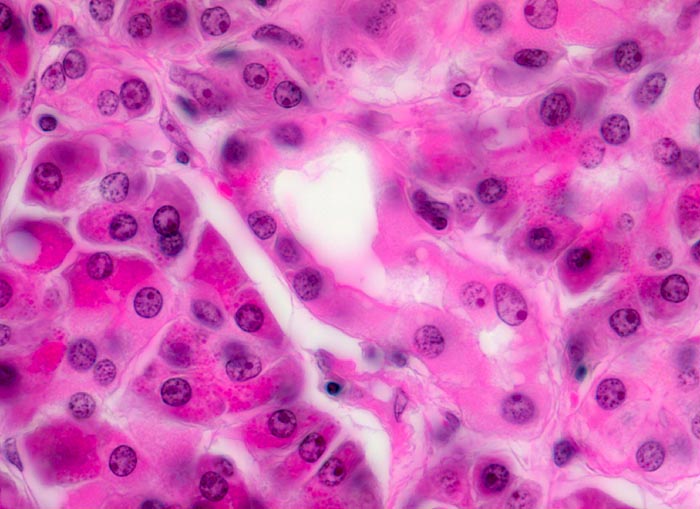 Links und rechts im Bild Azini des exokrinen Pankreas gruppiert um ein Schaltstück mit hellem kubischem Epithel in der Bildmitte.