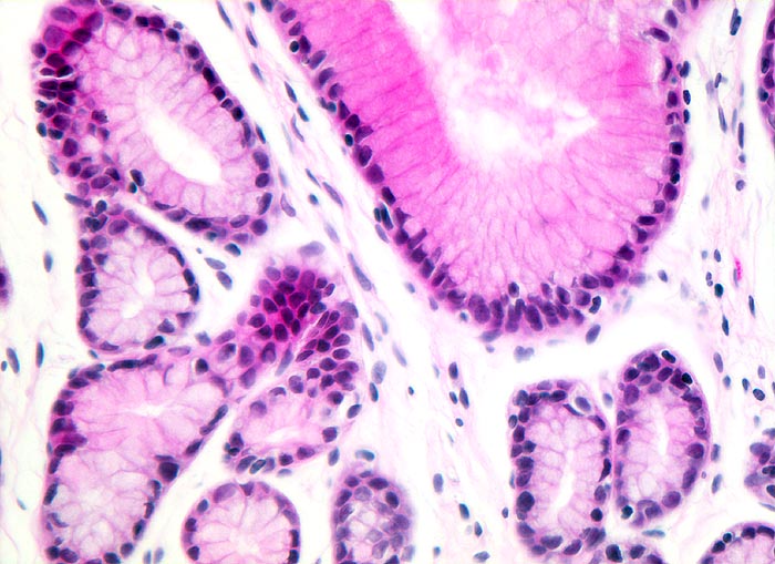 Schleimdrüsen. Das Stroma der Lamina propria enthält spindelige Fibroblasten und nur ganz vereinzelte Lymphozyten mit kleinen runden Kernen.