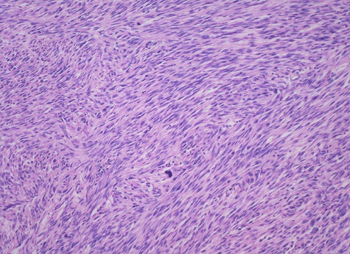 Zu breiten Bündeln angeordnete Tumorzellen mit geringen Kernatypien.