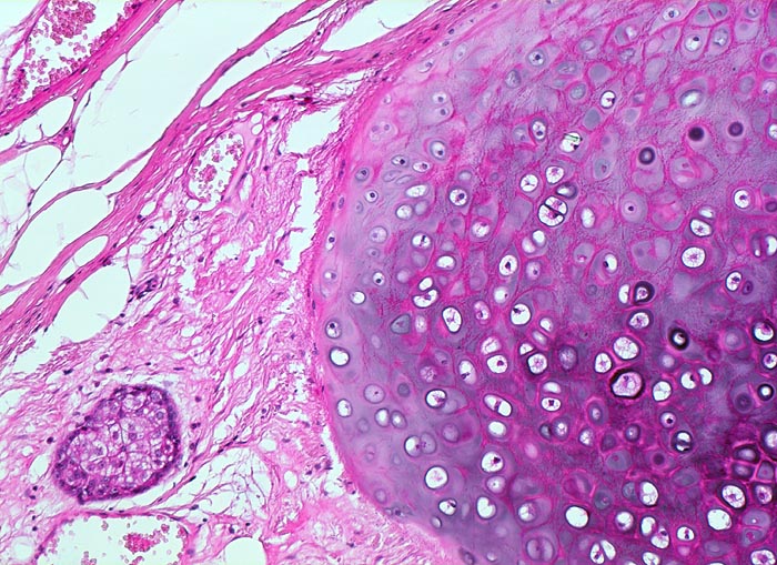 Ovar mit 8cm grossem prallelastischem Tumor mit glatter Oberfläche. Bei der Eröffnung des zystischen Tumors quellen Haare hervor, welche von Talgmassen durchsetzt sind. Auf der Zysteninnenseite haftet ein behaarter Knoten von 2cm Durchmesser mit fokalen Verkalkungen und lipomatösem Stroma (sogenannter Kopfhöcker).