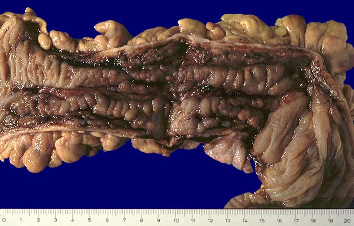 längsverlaufenden strassenartigen Ulzera. Die dazwischen liegende Schleimhaut kopfsteinpflasterartig vergröbert. Uebergang in ein 11cm langes