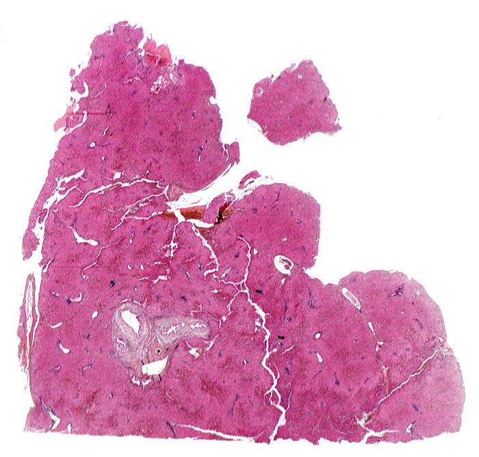 In der Übersicht ist ein grösseres Portalfeld erkennbar. Die Leberarchitektur ist unverändert mit normaler Beziehung von Portalfeldern und Zentralvenen. Eine Fibrose oder Knoten sind nicht erkennbar.