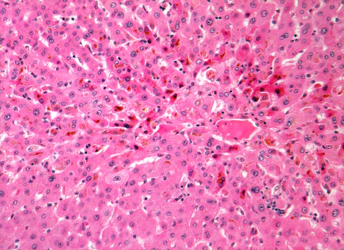 intracanaliculäre orangefarbene Gallepigmentablagerungen finden sich bevorzugt in der Zone 3 rund um die