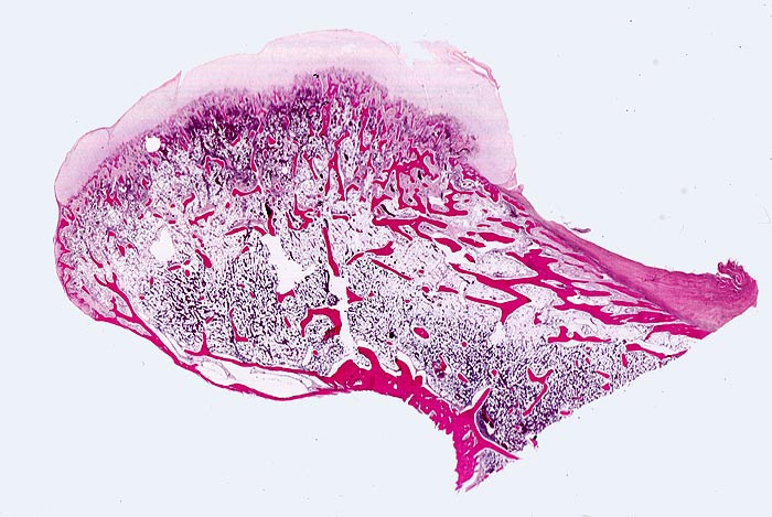Kappenförmig konfiguriertes hyalines Knorpelgewebe sitzt auf einem knöchernen Stiel. Die Knorpeloberfläche wird bedeckt von einem schmalen Saum aus zellarmem Bindegewebe (=Perichondrium). Übergang des Knorpels in enchondrale Ossifikationszone. Daran anschliessend normale Spongiosa.